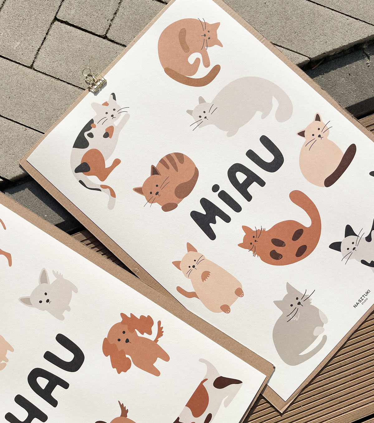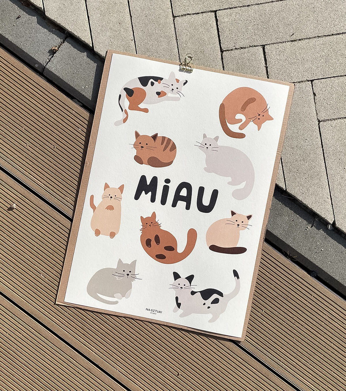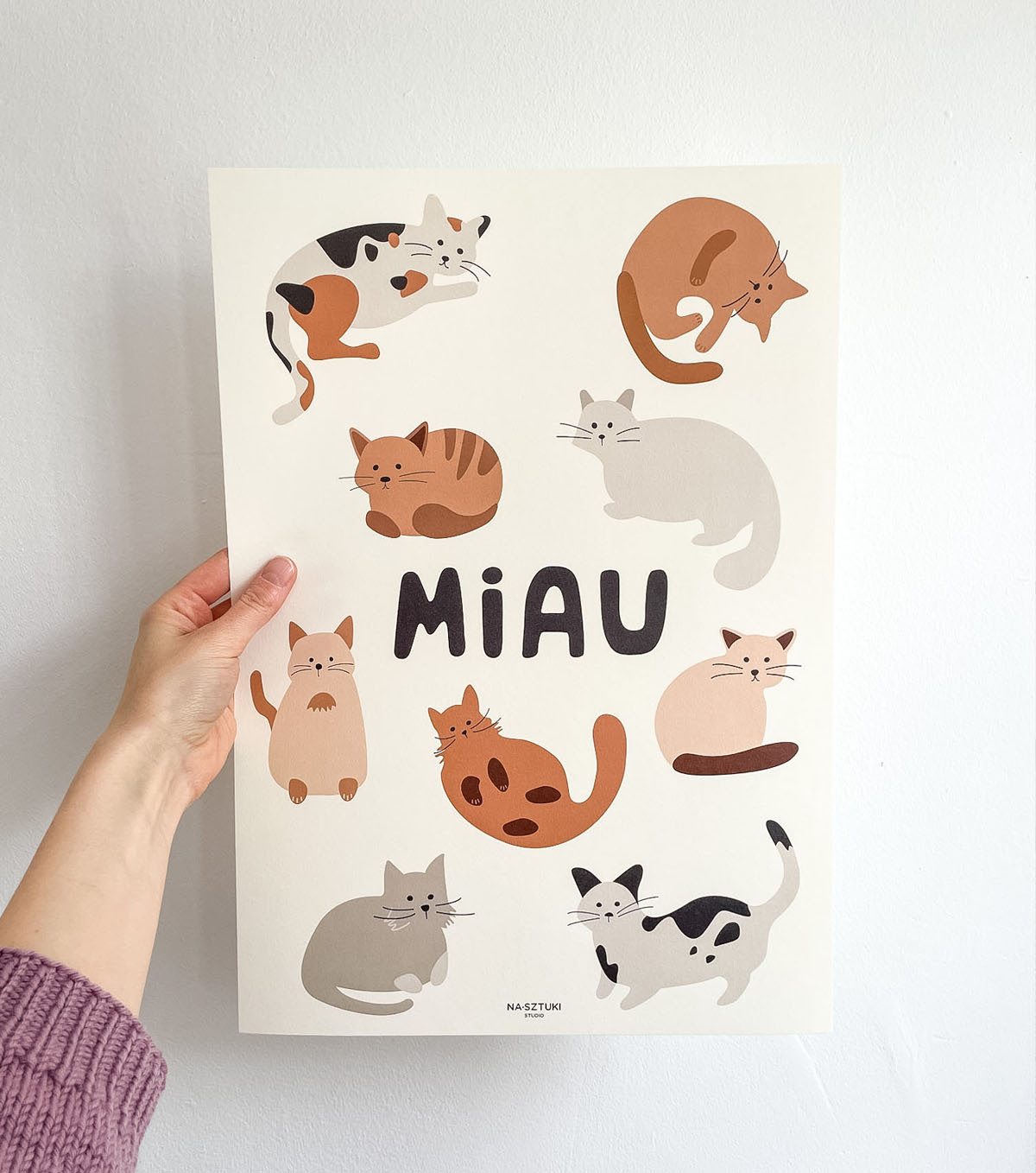 Autorski plakat w kociaki stworzony przeze mnie (Natalię Wiśniewską) to idealny dodatek do przestrzeni każdego miłośnika kotów! Ilustracja jest prosta i minimalistyczna, dzięki czemu świetnie komponuje się z wnętrzami w różnych stylach. Idealnie będzie pasować do pokoju dziecięcego. To fantastyczny pomysł na prezent dla osoby, która kocha kotków– zarówno dla dużych i małych miłośników wszystkich kotków.