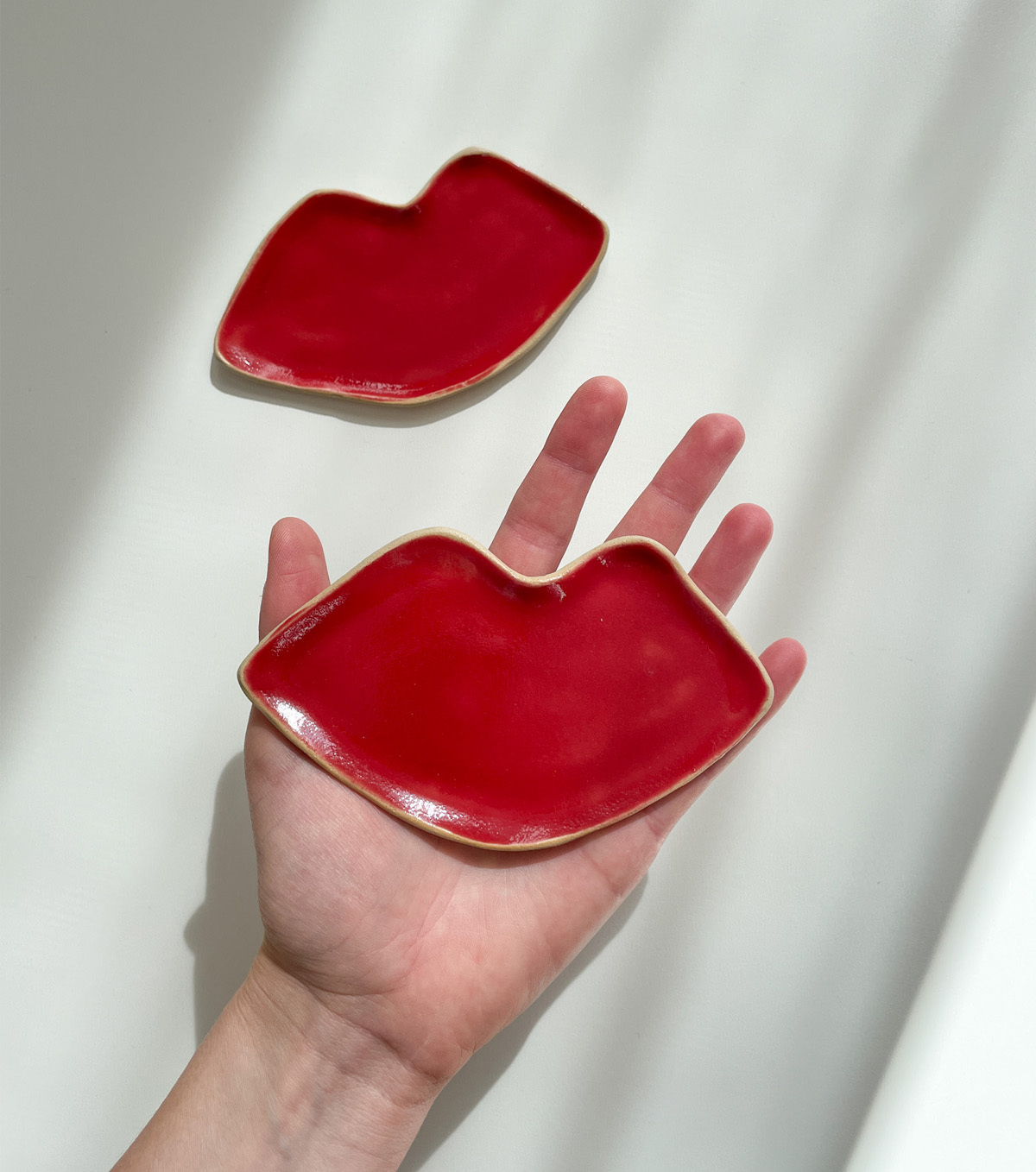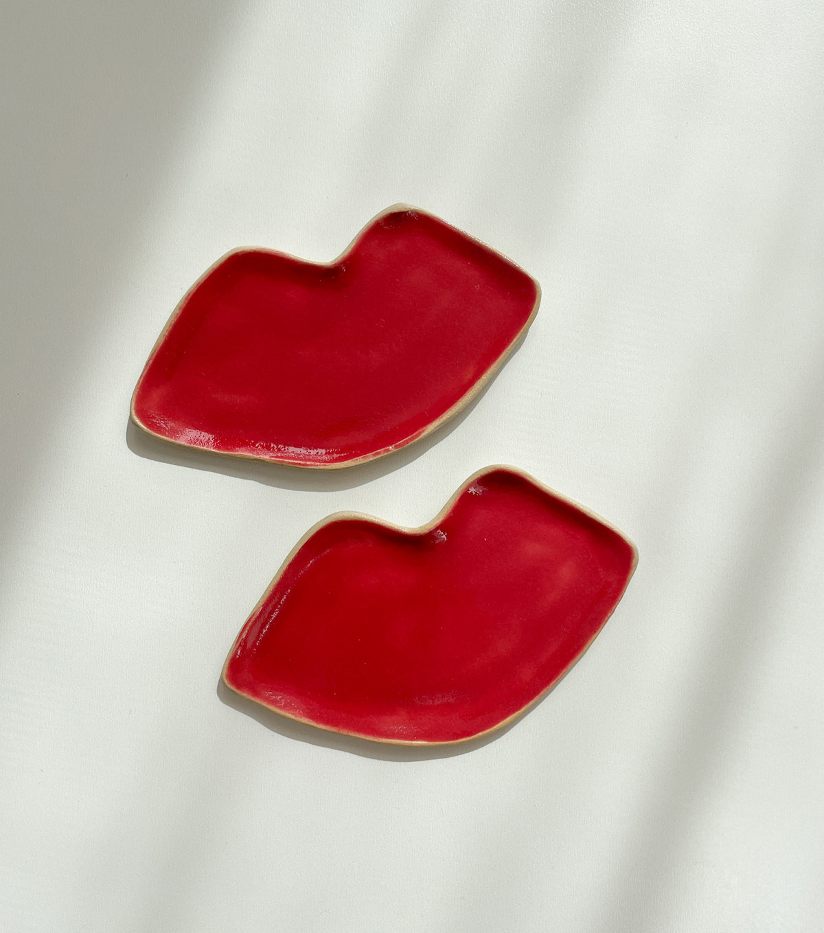 Talerzyk ceramiczny USTA- w kolorze krwistej czerwieni. Zrobiony z naturalnej jasnej gliny i proszkliwiony szkliwem.
