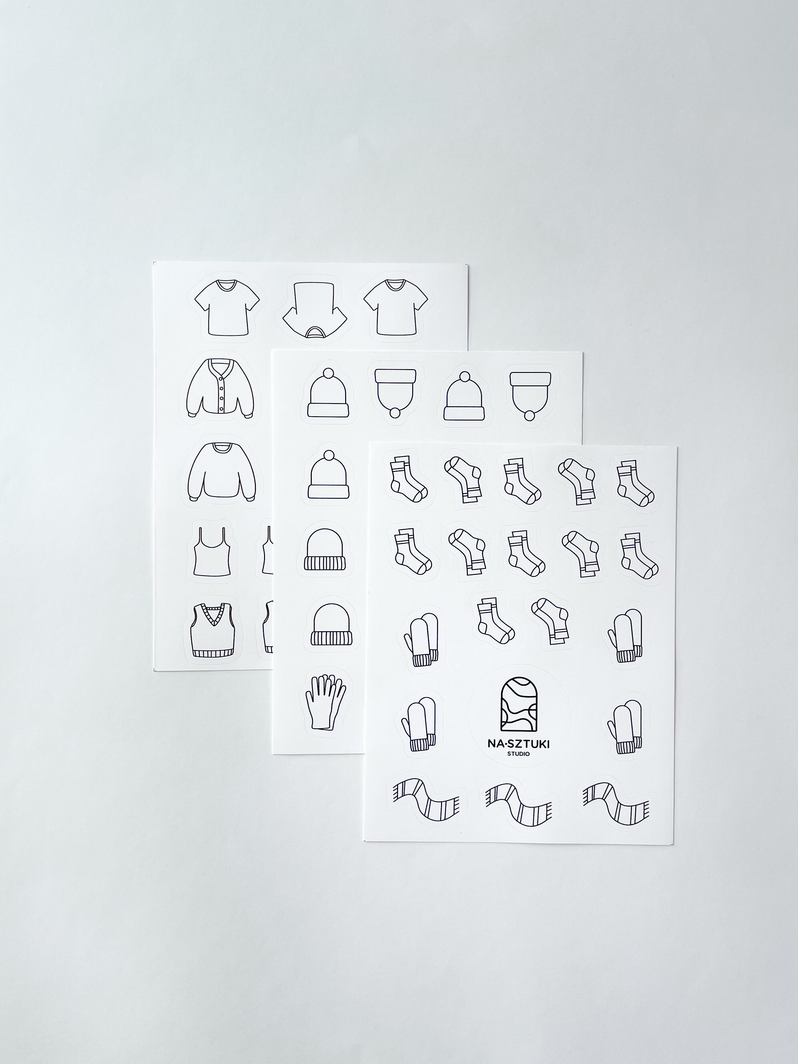 Naklejki stworzone z myślą, aby ułatwić prowadzenie notesu dziewiarskiego. Zostały wykonane na foli matowej, dzięki czemu można po nich rysować kredkami, ołówkami. Jeśli chodzi o flamastry, mazaki najlepiej sprawdzić na skrawku arkusza, czy przypadkiem się nie ściera.