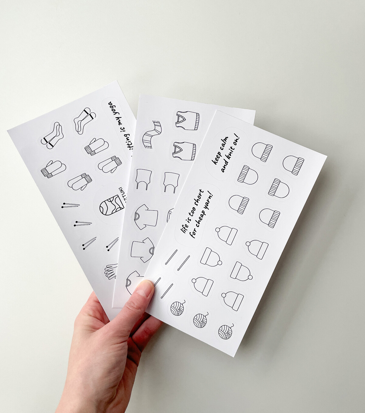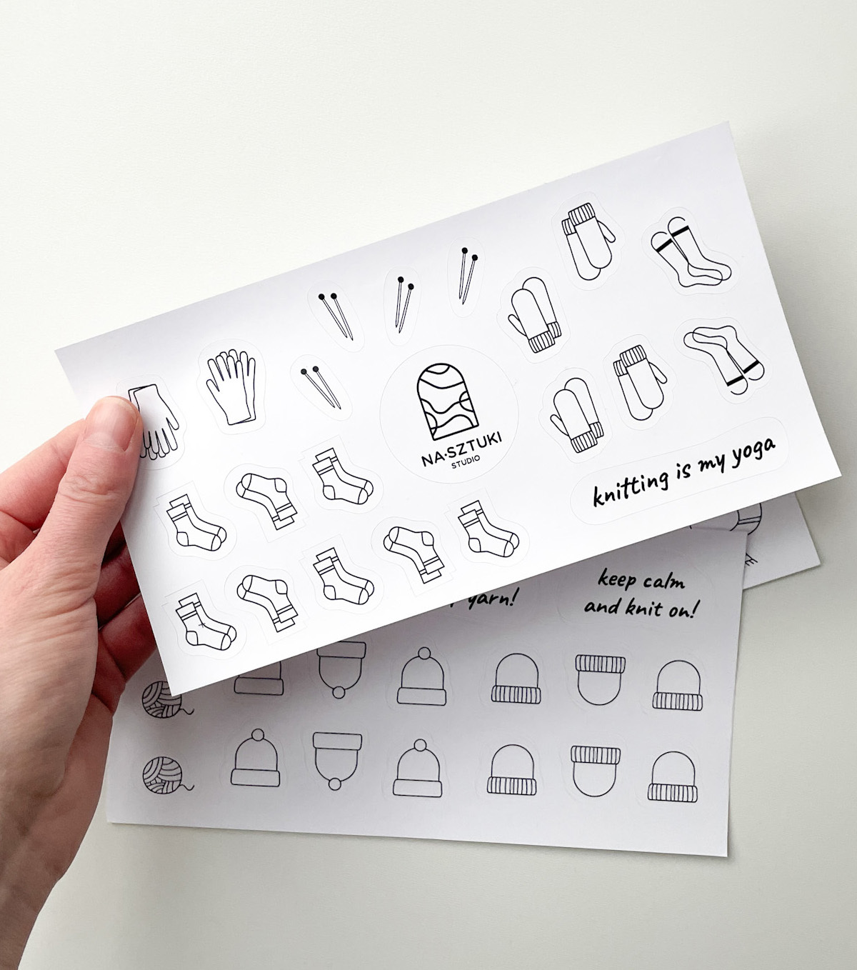 Zestaw naklejek idealny do dziewiarskiego notesu i nie tylko! Świetnie sprawdzi się jako ozdoba plannerów, kalendarzy, a także innych kreatywnych projektów. Naklejki wykonane są na wysokiej jakości matowej folii, dzięki czemu prezentują się elegancko i nie odbijają światła. To doskonały pomysł na prezent dla miłośników dziewiarstwa i osób, które lubią szydełkować. A także dla dzieci, które uwielbiają dekorować swoje zeszyty i notesy. Dodaj odrobinę kreatywności do swojej codzienności!