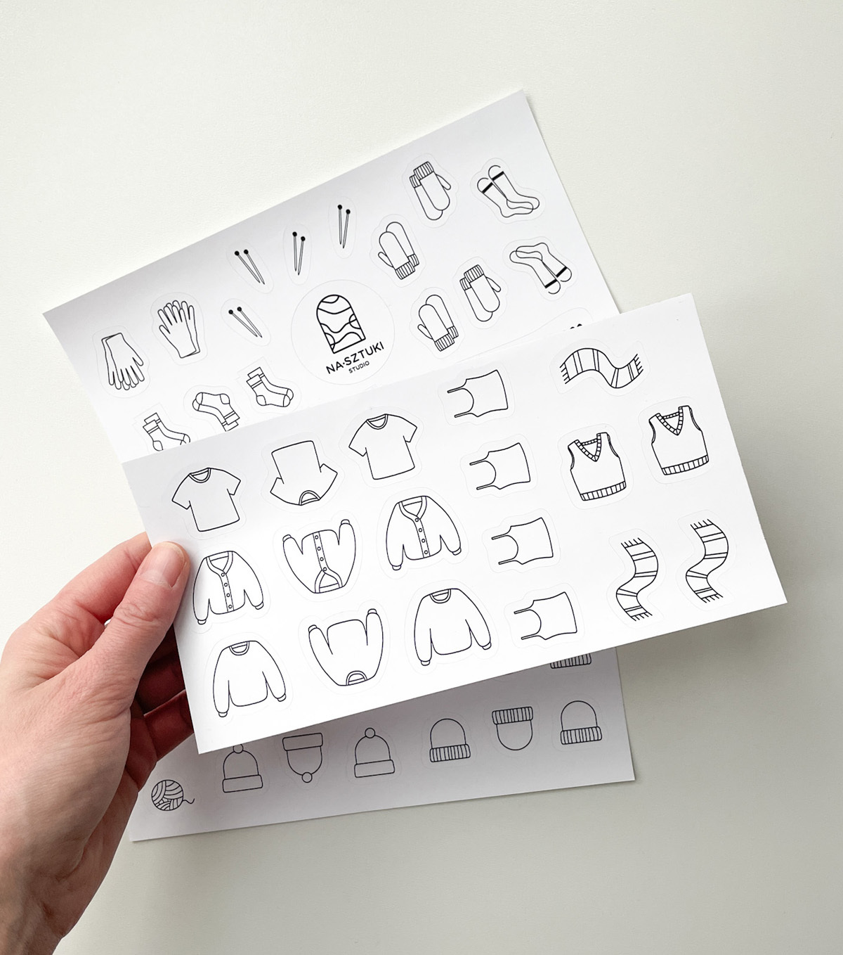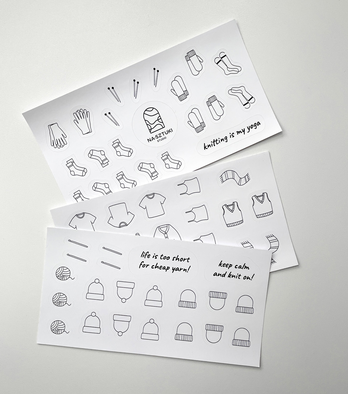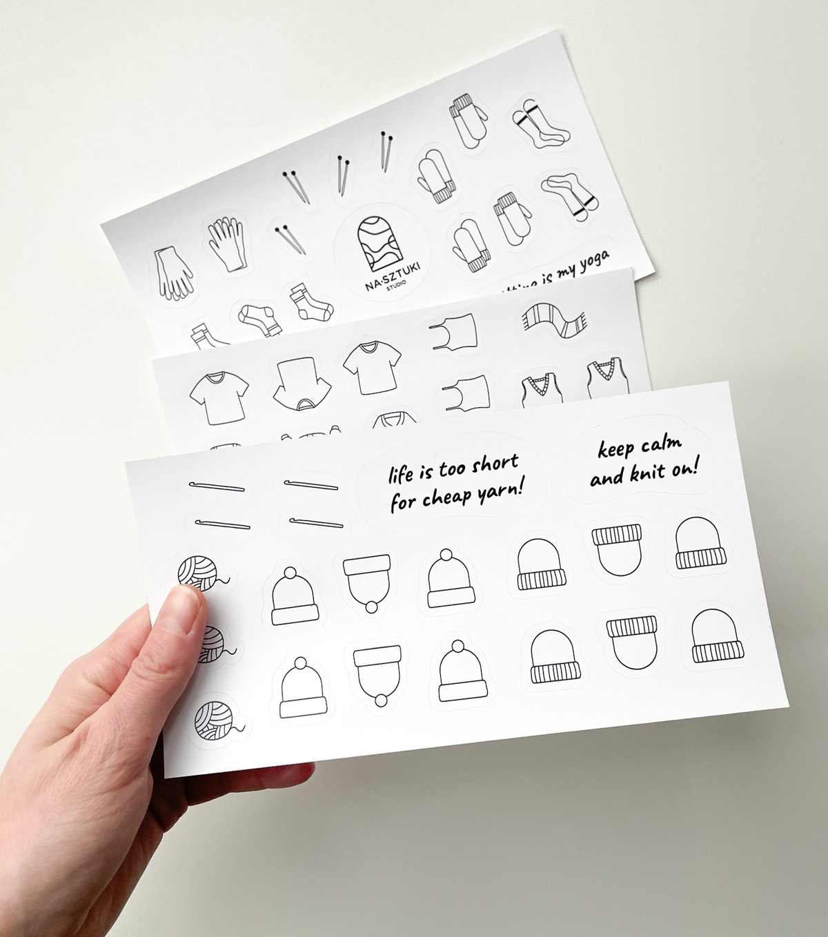Naklejki stworzone z myślą, aby ułatwić prowadzenie notesu dziewiarskiego. Zostały wykonane na foli matowej, dzięki czemu można po nich rysować kredkami, ołówkami. Jeśli chodzi o flamastry, mazaki najlepiej sprawdzić na skrawku arkusza, czy przypadkiem się nie ściera.