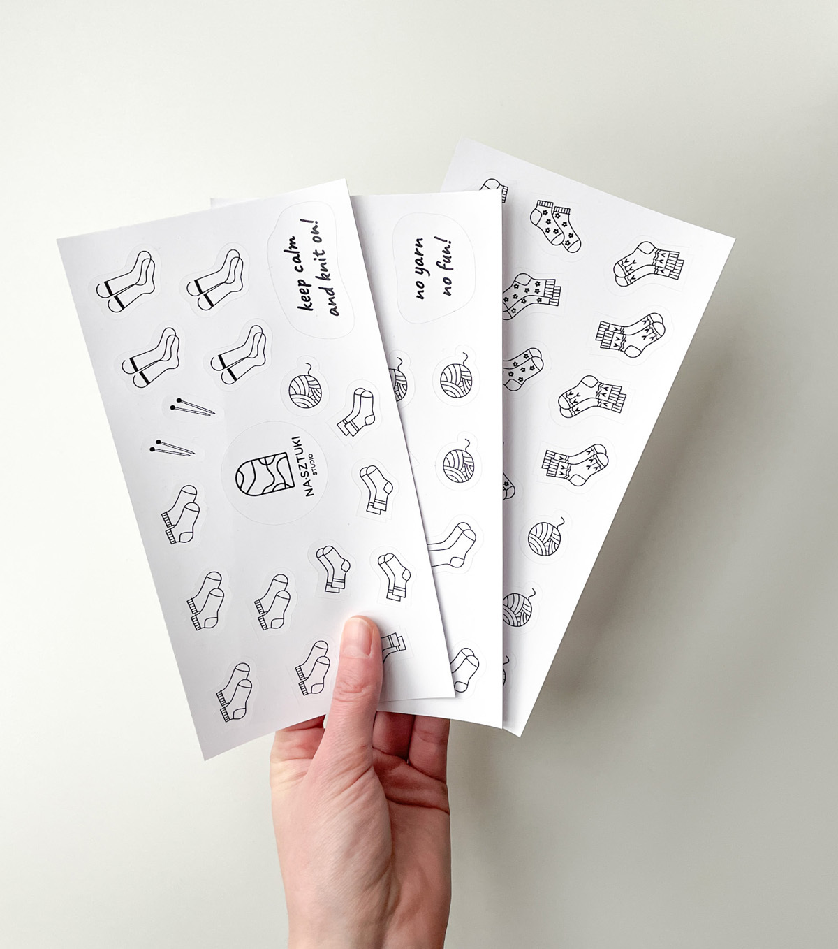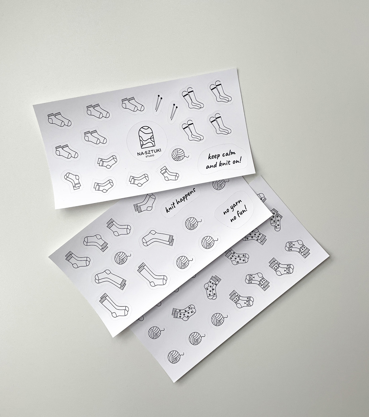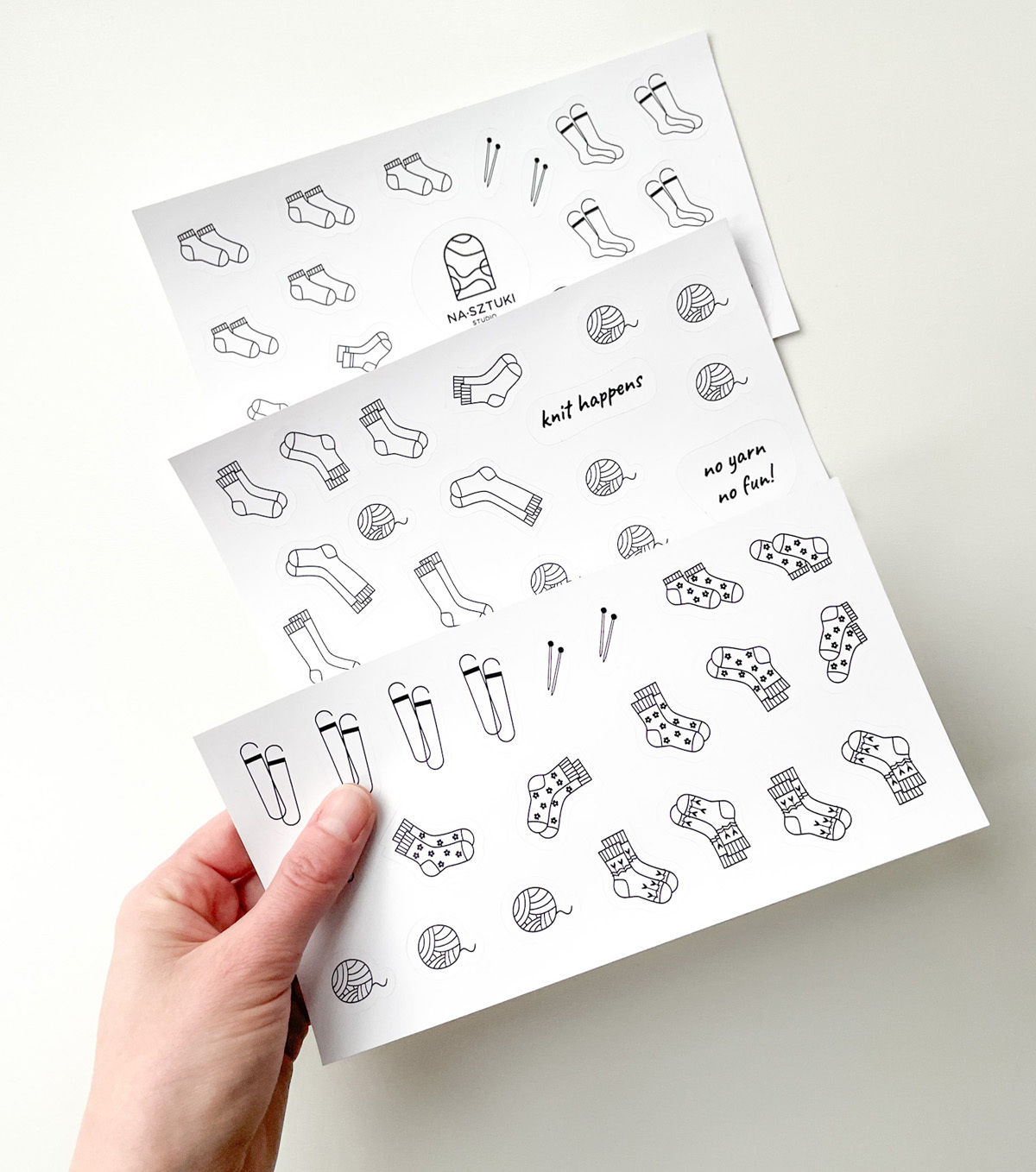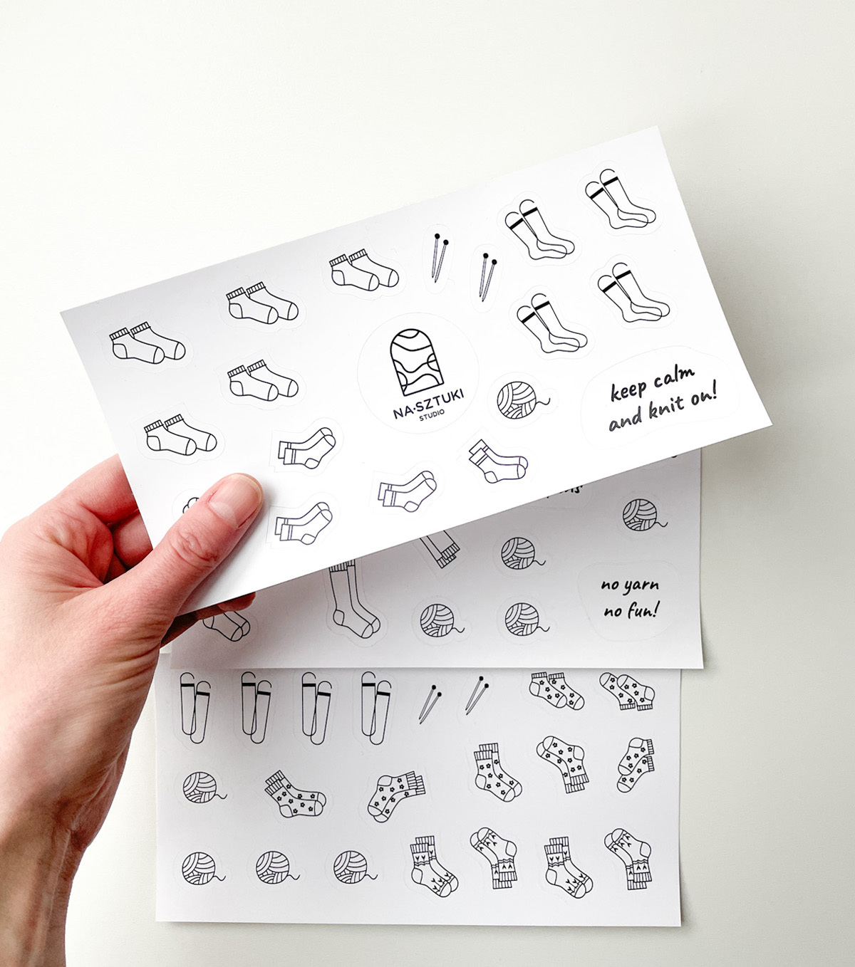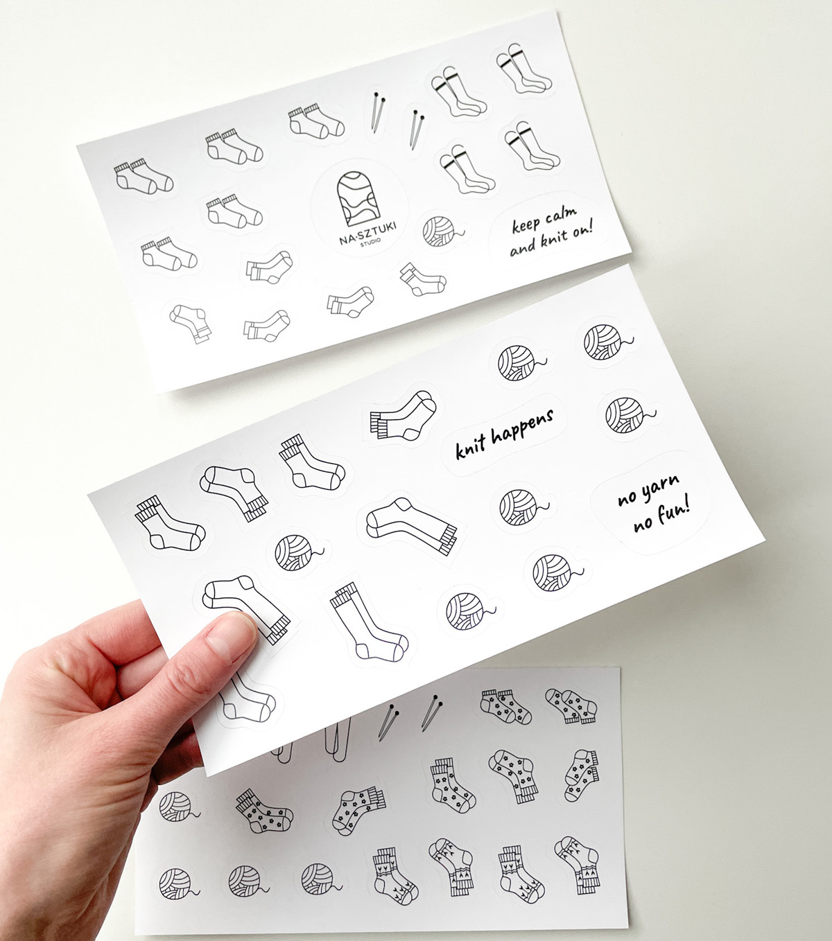 Naklejki stworzone z myślą, aby ułatwić prowadzenie notesu dziewiarskiego. Zostały wykonane na foli matowej, dzięki czemu można po nich rysować kredkami, ołówkami. Jeśli chodzi o flamastry, mazaki najlepiej sprawdzić na skrawku arkusza, czy przypadkiem się nie ściera.
