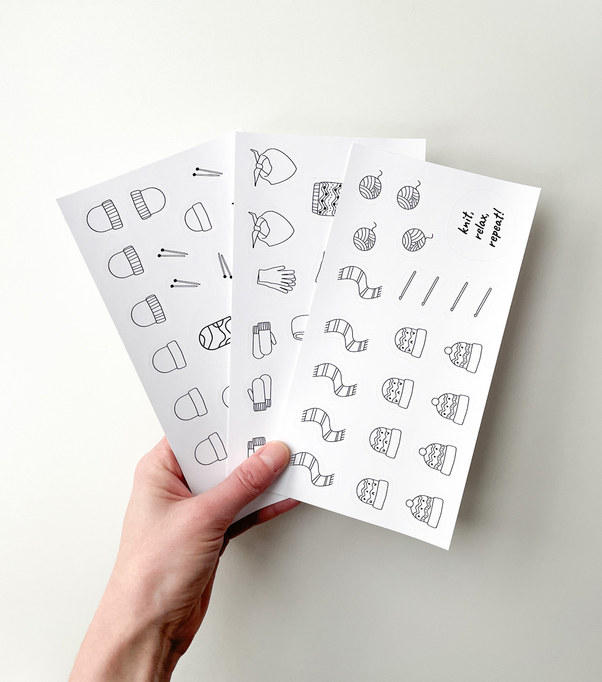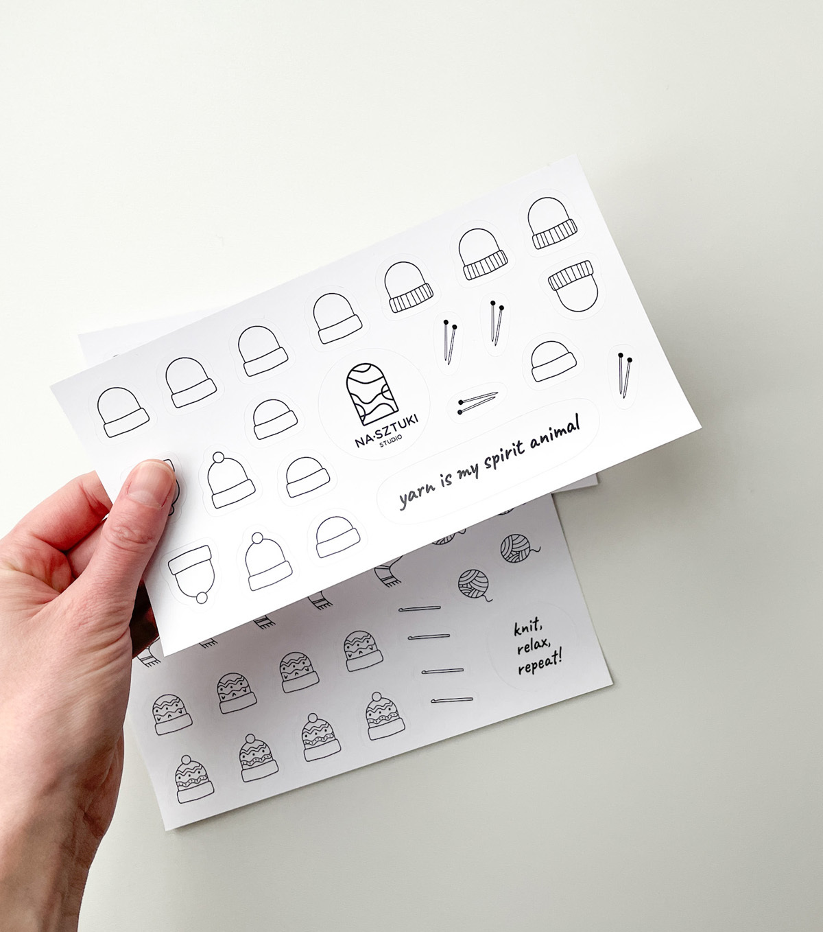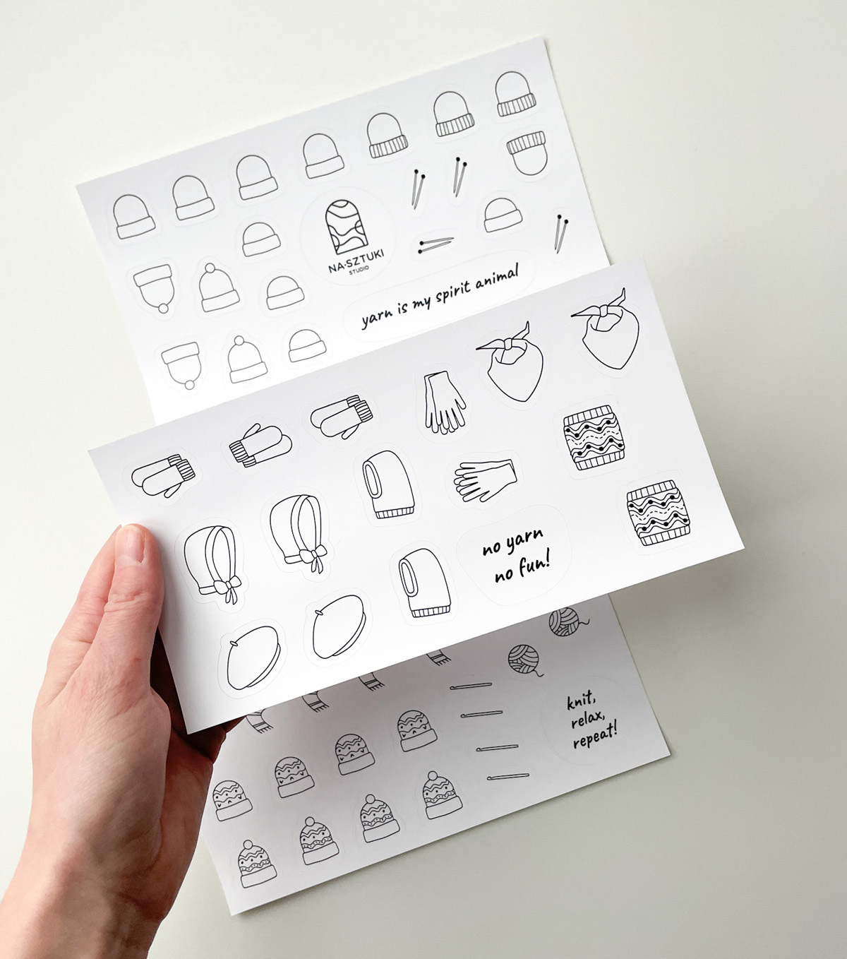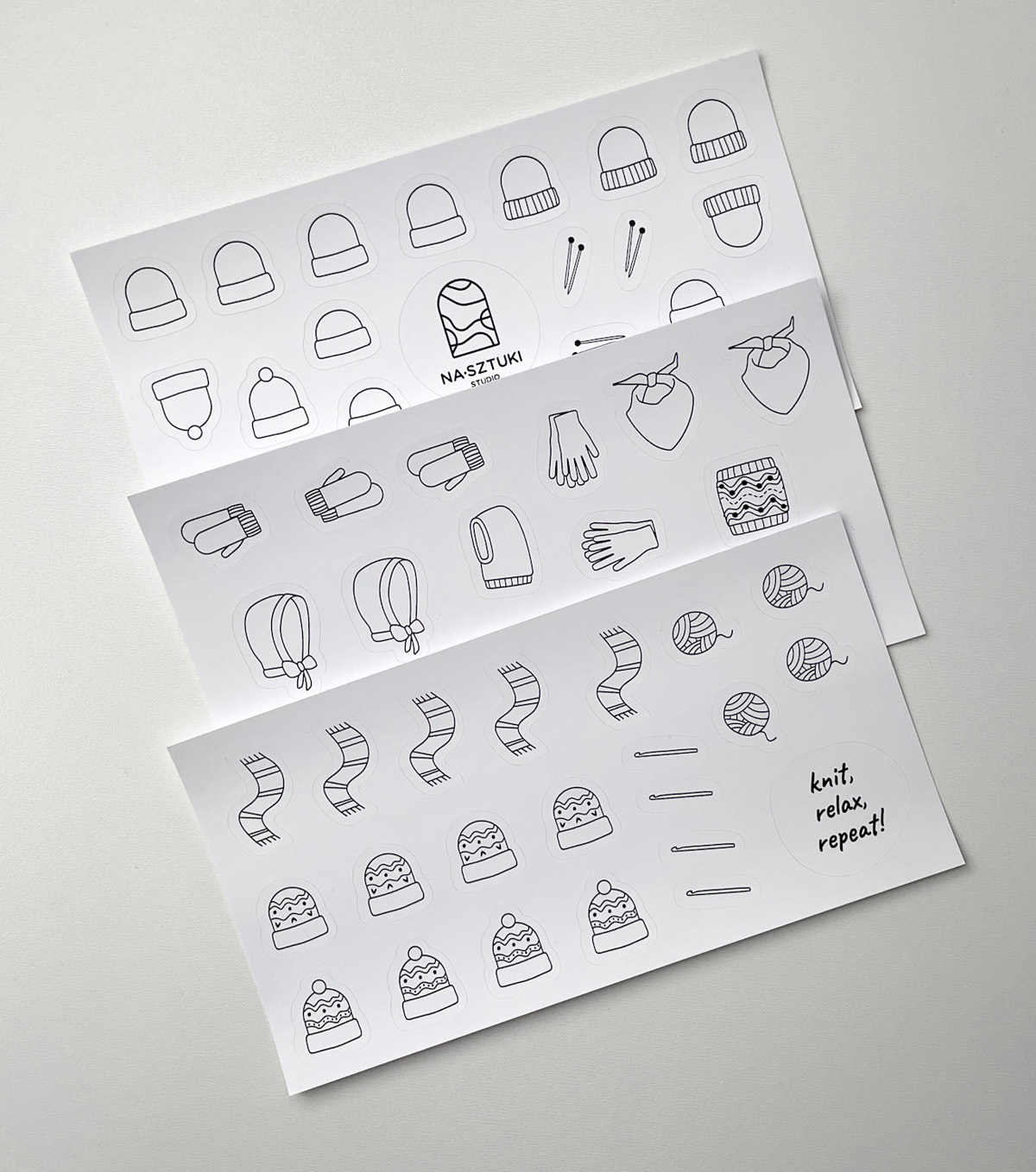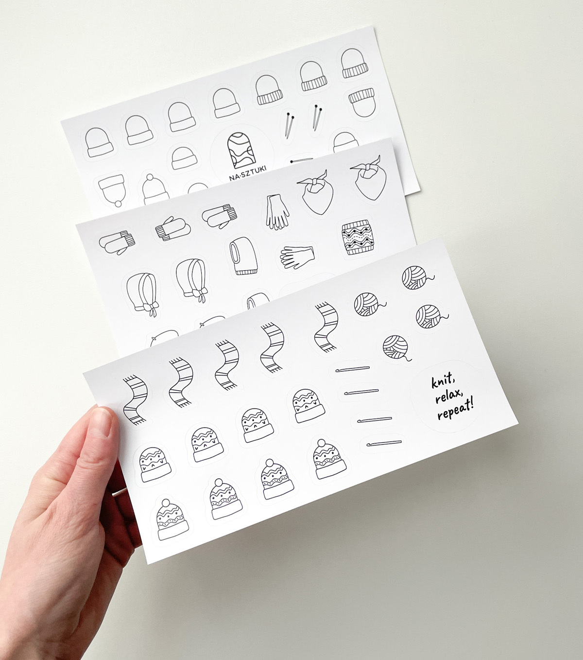 Naklejki stworzone z myślą, aby ułatwić prowadzenie notesu dziewiarskiego. Zostały wykonane na foli matowej, dzięki czemu można po nich rysować kredkami, ołówkami. Jeśli chodzi o flamastry, mazaki najlepiej sprawdzić na skrawku arkusza, czy przypadkiem się nie ściera.